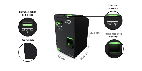 • Capacidad para hasta 1000 billetes y 1000 monedas